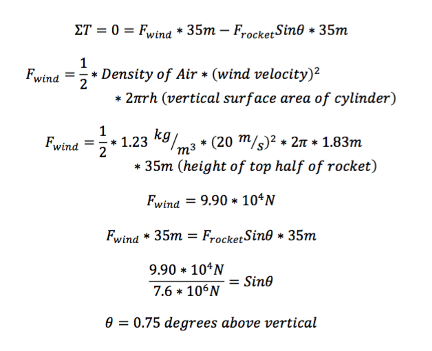 If the Falcon 9 Rocket is 70 meters tall, has a mass of 549,054 kg, diameter of 3.66 meters and can produce a thrust of 7,607,000 N, at what angle does the engine need to be pointed to counteract the force of wind blowing at 20 m/s?